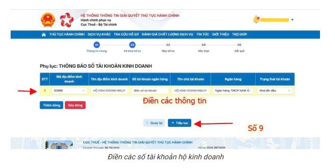 Bước 9: Điền thông tin các số tài khoản kinh doanh. Bấm “Thêm dòng” và tiếp tục điền nếu bạn có nhiều tài khoản
