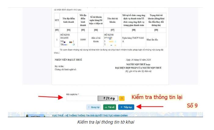 Bước 10: Kiểm tra lại thông tin, nhập mã capcha và bấm “Tiếp tục“