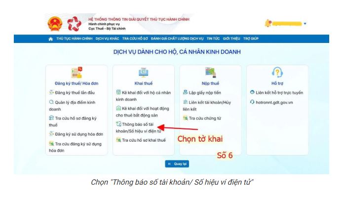 Bước 6: Chọn “Thông báo số tài khoản/ Số hiệu ví điện tử”